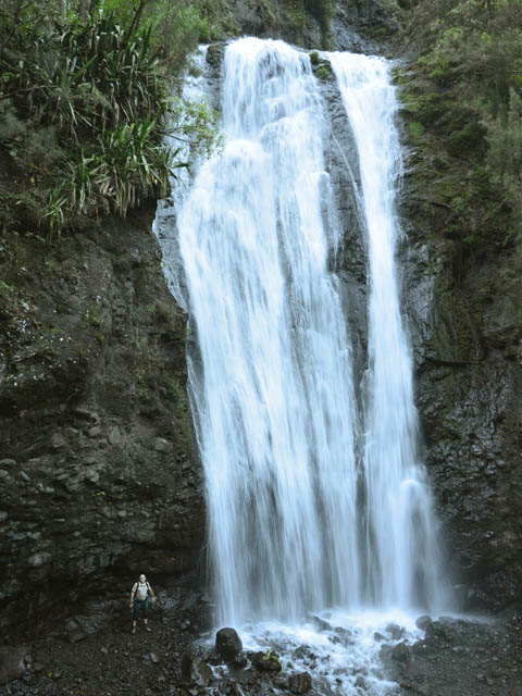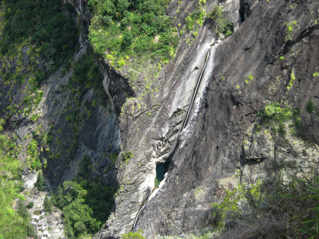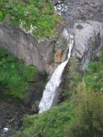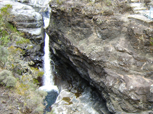 Cascade totalement artificielle qui jaillit au bas de la centrale électrique du Bras de la Plaine. Son débit est fonction de l'activité de la petite usine et il est bien sûr totalement interdit de s'y baigner !