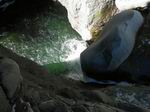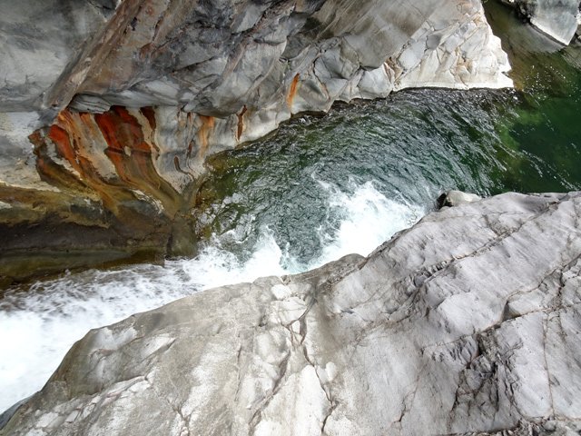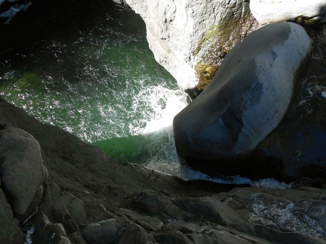 La photo est prise du sommet de la Chapelle quand on s'éloigne un peu du bassin Roche vers l'aval. Il ne faut pas trop se pencher pour les admirer de trop près. Le débit peut y être très impressionnant. Réservées aux canyoneurs ou randonneurs un peu fous.