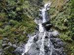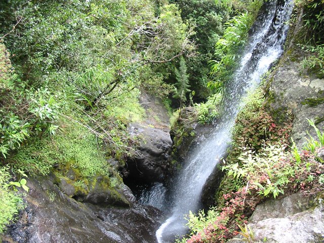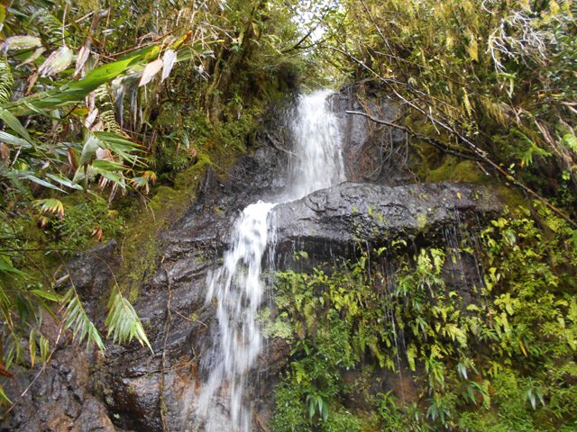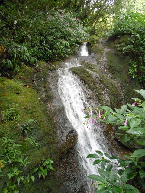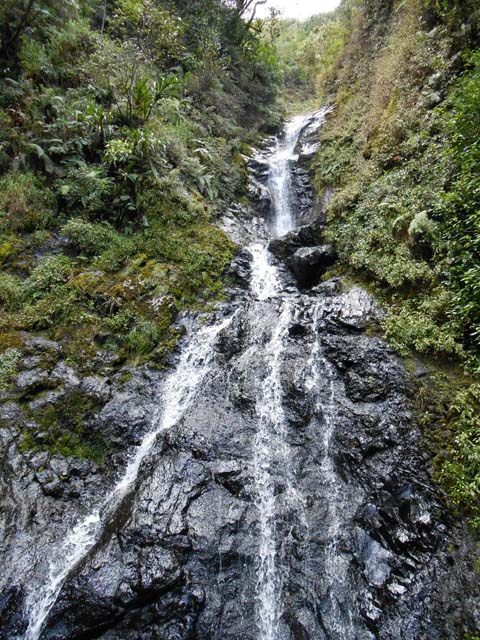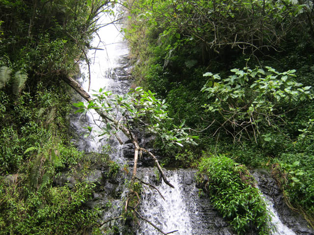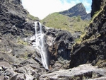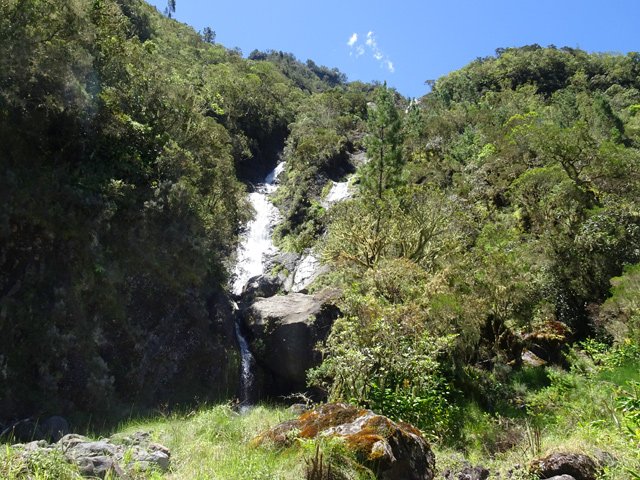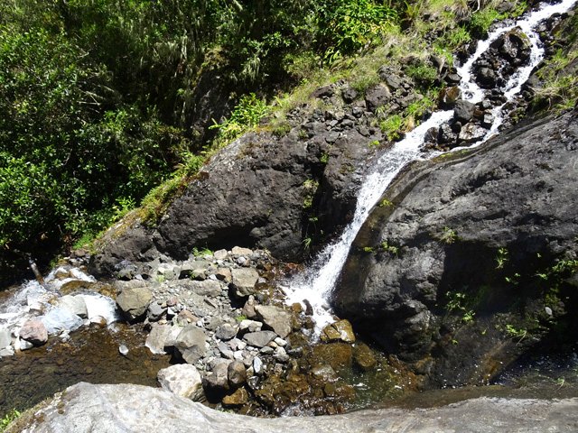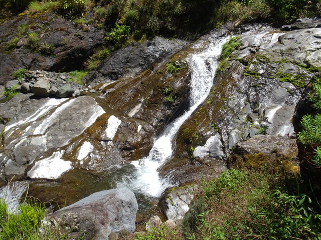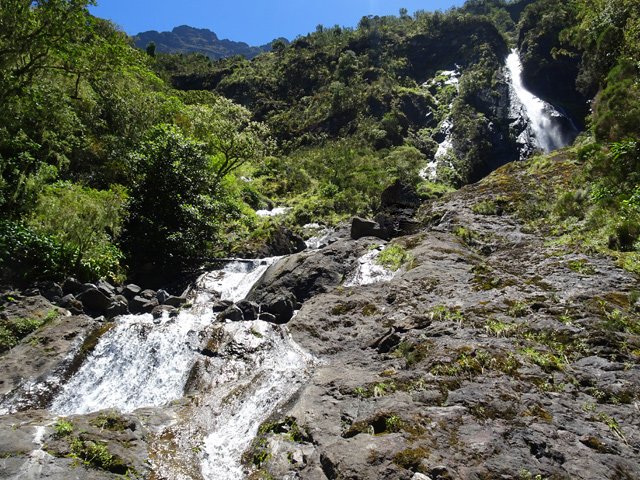 La cascade est longue et tombe en plusieurs paliers très hauts. Le palier photographié est le dernier avant la jonction de l'affluent et du Bras de Benjoin.