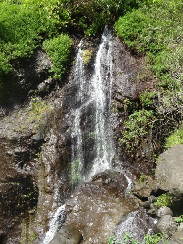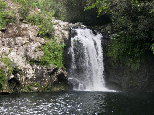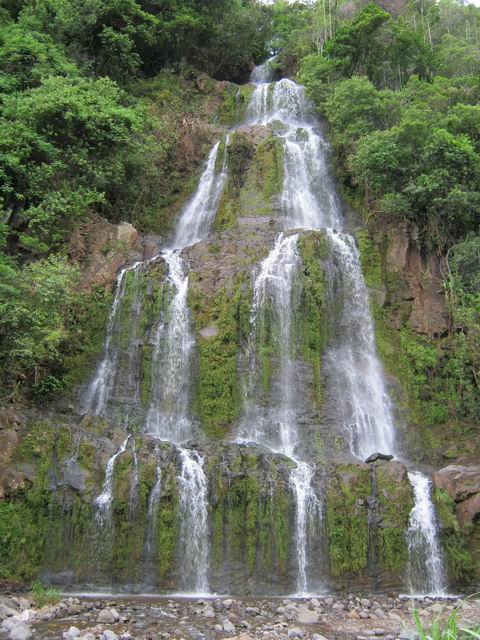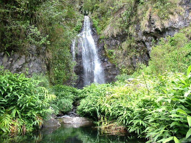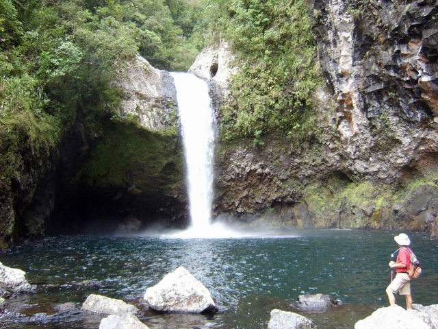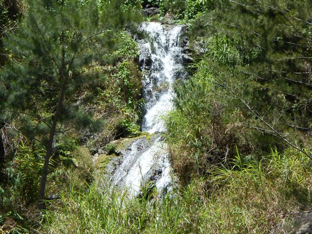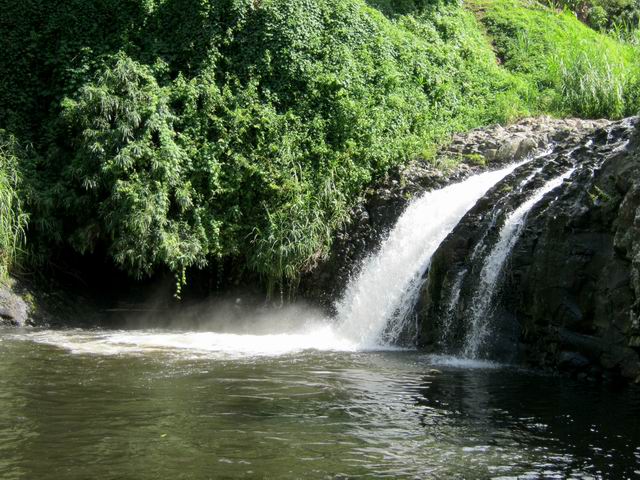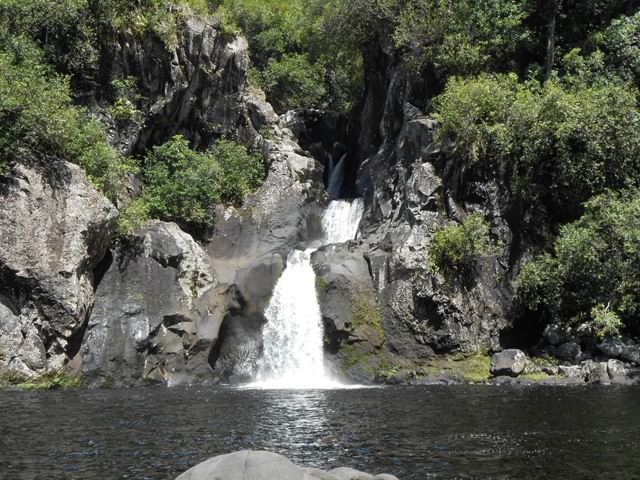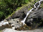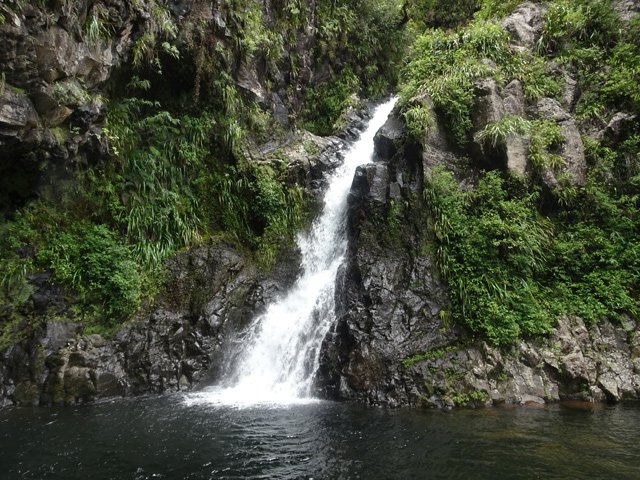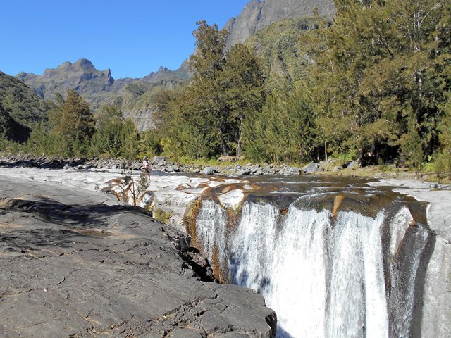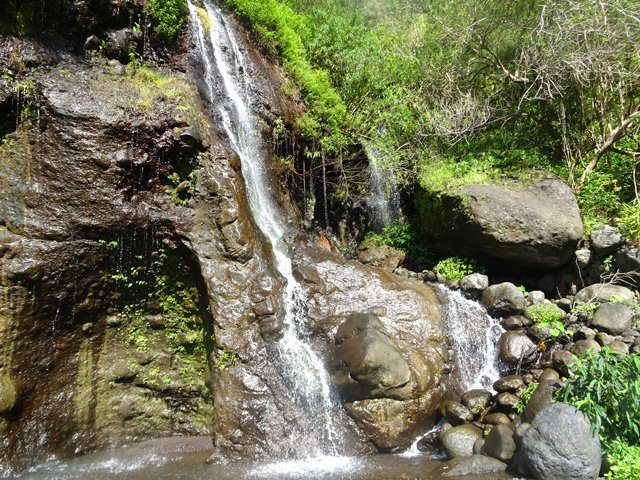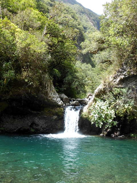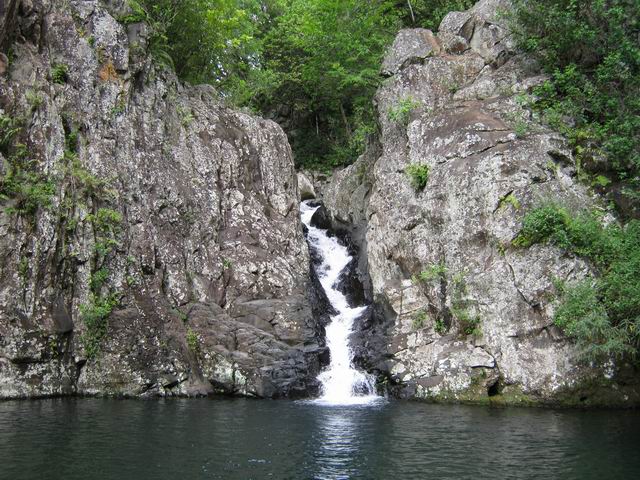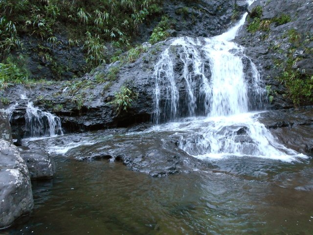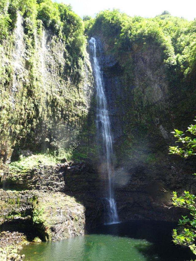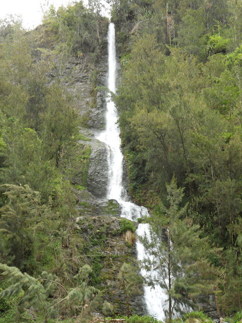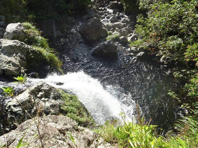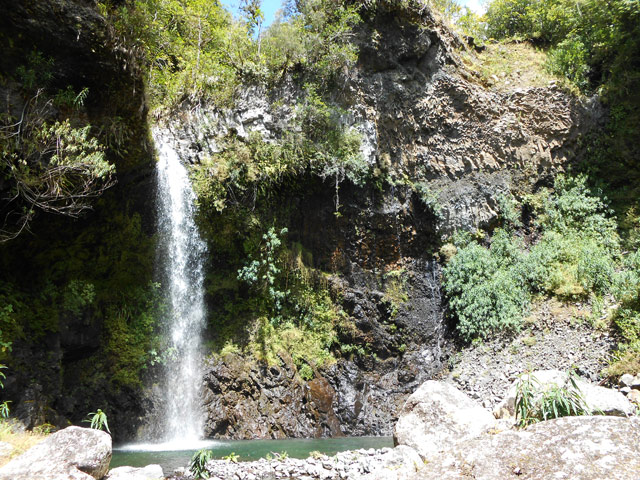 Cette fine cascade est alimentée par le Bras Long qui coule à la Mare. Malgré un petit bassin, on ne s'y baigne pas puisqu'on vient de traverser déjà 20 fois la rivière et qu'on n'éprouve plus de plaisir à se mouiller !
