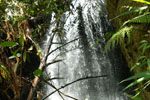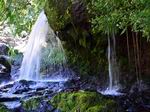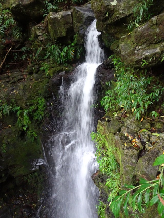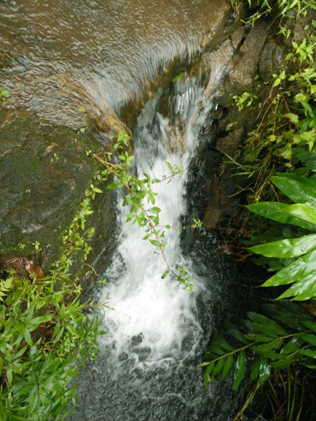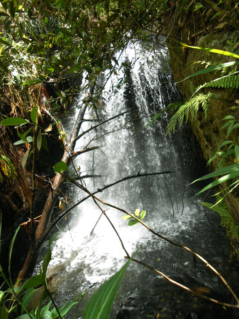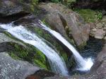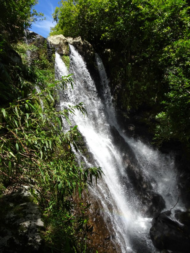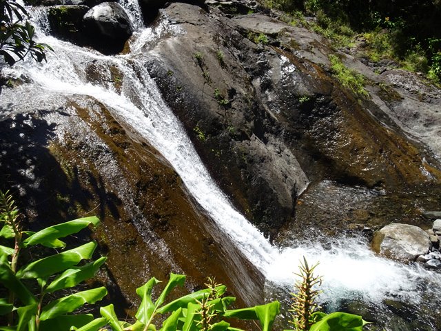 Fin voile d'eau claire tombant en paliers depuis les hauteurs de l'îlet abandonné du Bras Rouge sur la Ravine Ferrière. Le petit bassin éclaboussé est situé près du gué permettant de traverser la ravine. A réserver pour un bain un jour de forte chaleur.