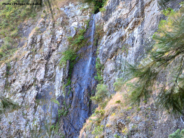 Cette chute, haute d'une dizaine de mètres, présente sur ses flancs de belles traces ferrugineuses.