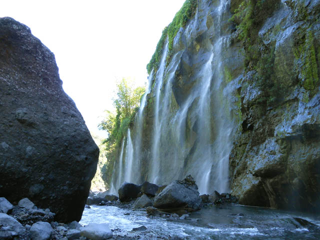 Il n'y a pas d'eau toute l'année. Le trajet pour y parvenir est dangereux à sec, donc plus dangereux lorsque coule la cascade. Attention de ne pas glisser. A gauche, dans une cavité, des vierges guettent l'arrivée de l'eau.