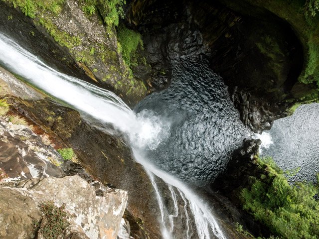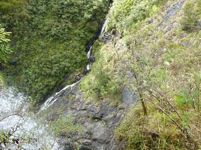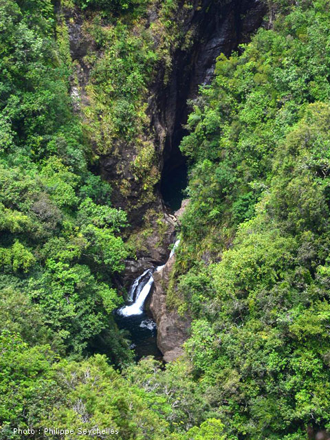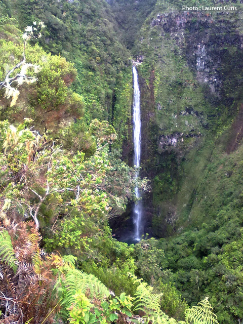 La vue de cette cascade est réservée aux aventuriers qui tenteront de descendre la Ravine de la Roche Pendue à partir de la Plate Forme.