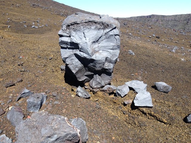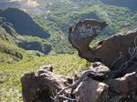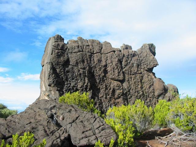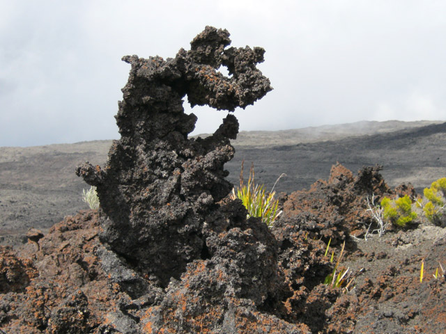 Dans le même domaine mais issues d'éruptions plus récentes, on rencontre parfois des sculptures de gratons comme ce guetteur aux jumelles fixées sur l'horizon, scrutant l'arrivée de randonneurs ou une nouvelle éruption.