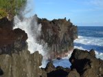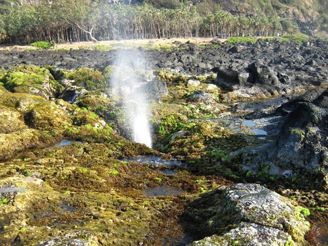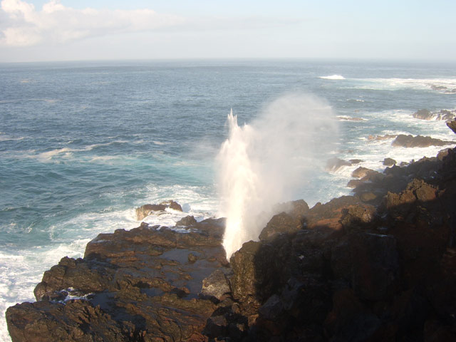 De tous petit tunnels creusés dans les falaises basaltiques du littoral reçoivent à longueur de journée des vagues qui poussent l'eau qui s'engouffre dans ces anfractuosités et la rejettent violemment, créant de petits geysers bruyants. Certains, plus difficiles à repérer n'évacuent que de l'air. C'est au bruit qu'on les repère alors que les geysers se voient de très loin.
