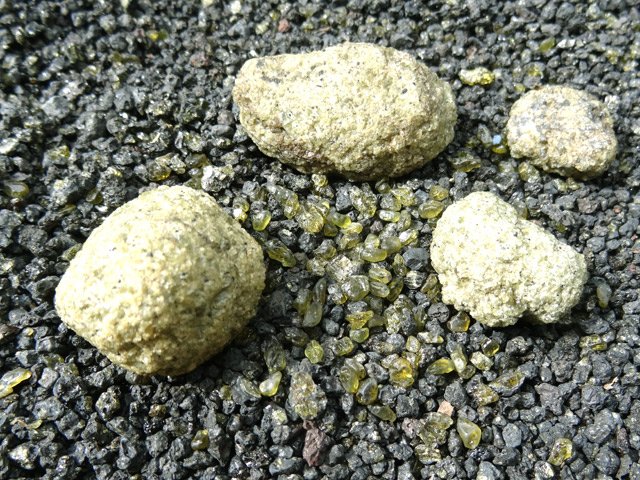 On en trouve dans presque tous les galets de l'île en les regardant de plus près. Les dunites se ramassent sur la Plaine des Sables. Le sable gris en contient toujours comme les plages vers l'Etang Salé. Ici, le sable provient de la nouvelle plage du Tremblet qui a d'ailleurs été baptisée Plage Verte.