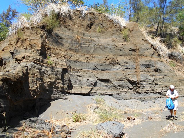 En coupe, les dunes présentent une succession de niveau finement stratifiés résultat d’un transport par les vents. On remarque des couches de différentes couleurs liées aux matériaux transportés (basalte, olivine, feldspath et très peu de corail) et à la direction du vent.