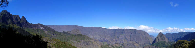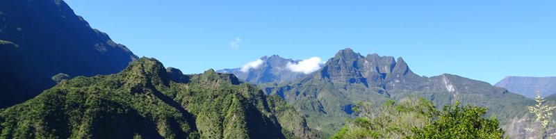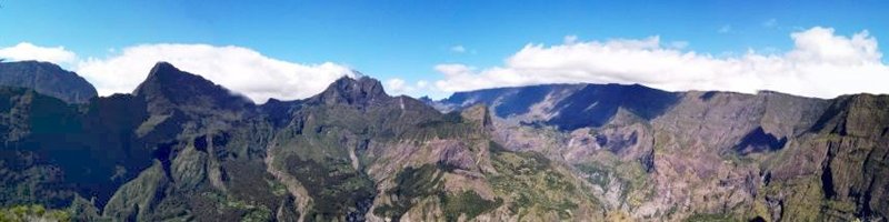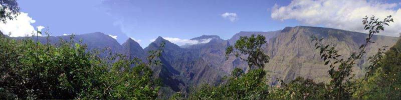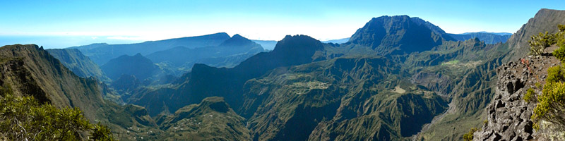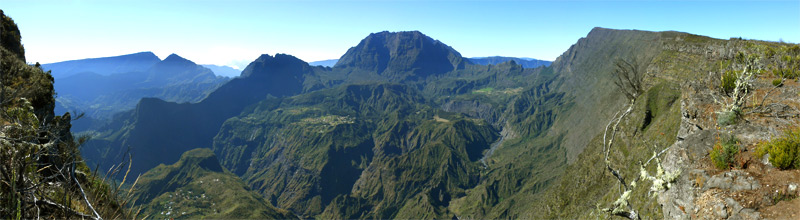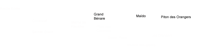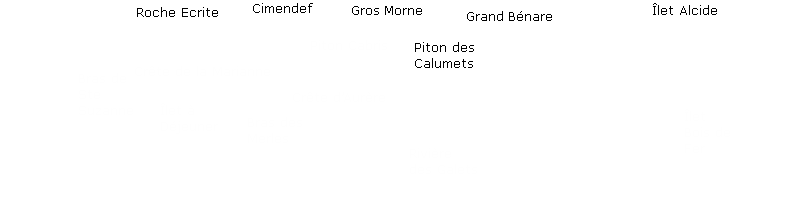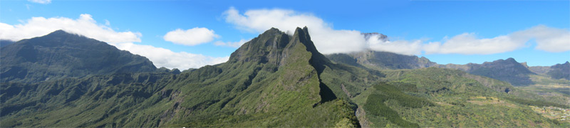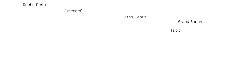 A gauche : La Roche EcriteAu centre : Les Crêtes de la Marianne, le Cimendef, le Piton des Neiges et le Piton Cabris.