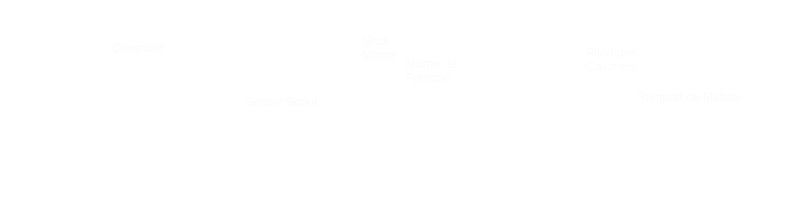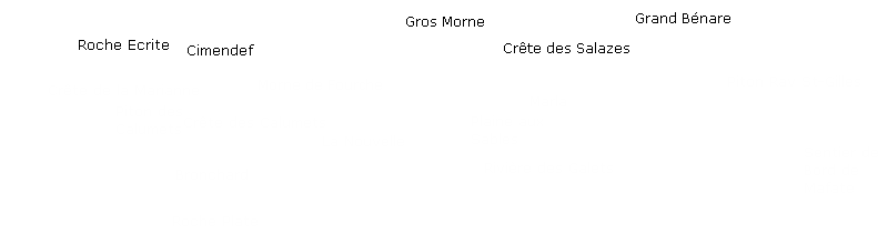 A gauche : La Roche EcriteAu centre : Les Crêtes de la Marianne, le Cimendef et le Piton Cabris.