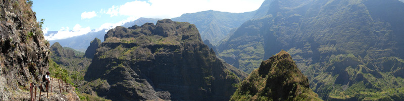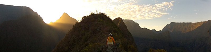 A gauche : Gilles un jour très ennuagé - le sentier du Rempart de Mafate, la Roche Ecrite, le CimendefAu centre : Le Morne de Fourche, le Gros Morne