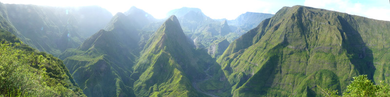 A gauche : Le rempart de MafateAu centre : La vallée de la Rivière des Galets