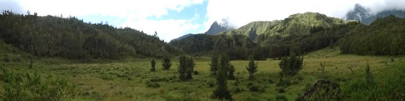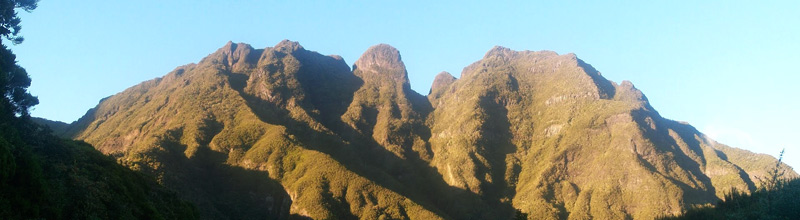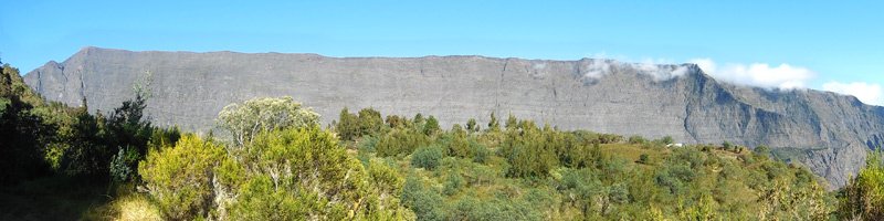 A gauche : Les flancs du Piton CabrisAu centre : Le Piton Tortue et le Piton des Calumets. Au fond, Piton des Neiges