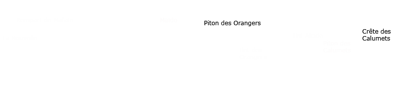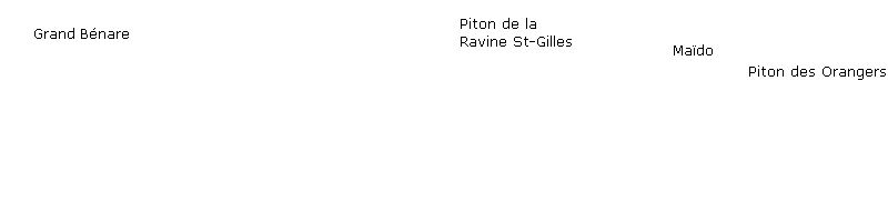 A gauche : Le Piton de la Ravine de Saint Gilles - le rempart de Mafate, le Bronchard, la Roche EcriteAu centre : Le Morne de Fourche, le Gros Morne et la Nouvelle.