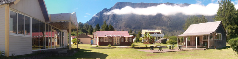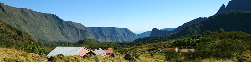 A gauche : Une case de Roche PlateAu centre : Le Piton de Roche Plate et les flancs du Maïdo