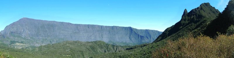 A gauche : Les flancs du Morne de Fourche et la forêt de cryptomerias du Piton MarmiteAu centre : Le Cirque de Salazie.