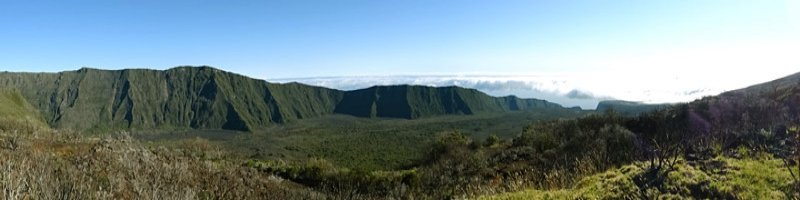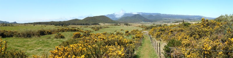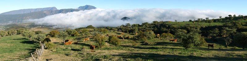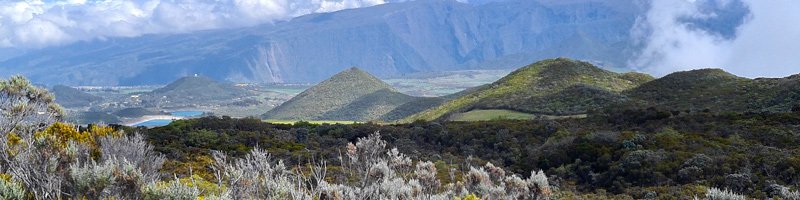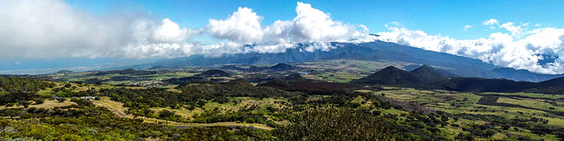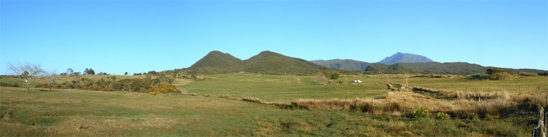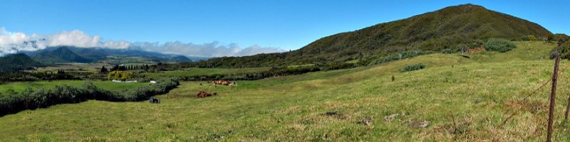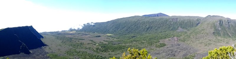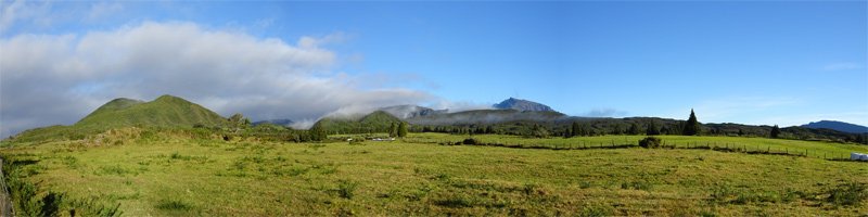 A gauche : Les prairies de BiberonAu centre : Le Piton de la Source et le Piton Rouge. La Fournaise derrière le nuage