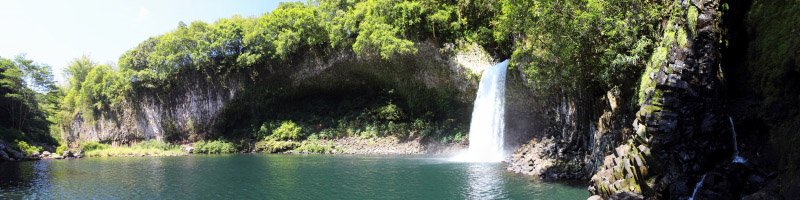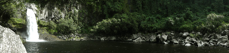 A gauche : la cascadeAu centre : Pas de panorama mais un grand angle pour voir en même temps la cascade et le bassin.