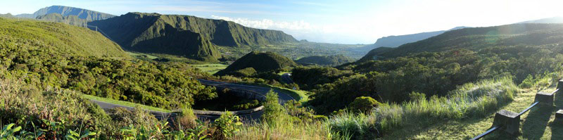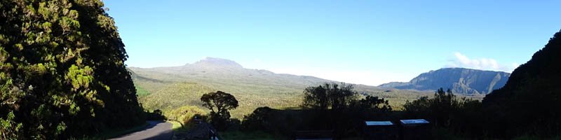 A gauche : La route forestière de Bélouve au colAu centre : Le Piton des Neiges et la Plaine des Marsouins