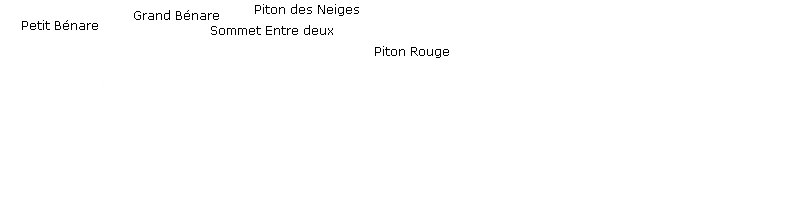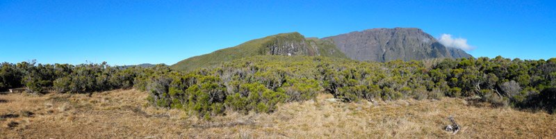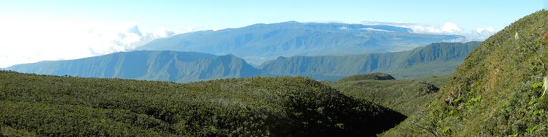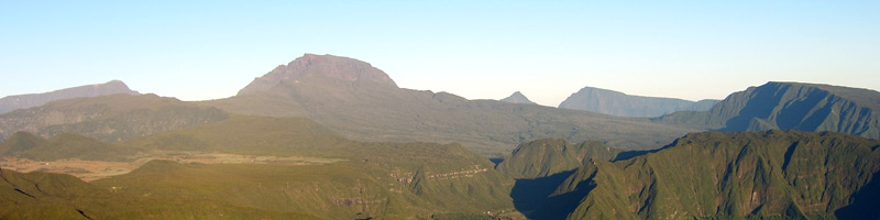 A gauche : Les hauts du Dimitile et le Grand BénareAu centre : Le Piton des Neiges, les prairies et le sommet du Piton Rouge