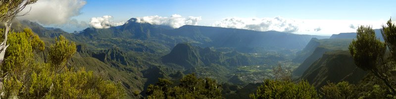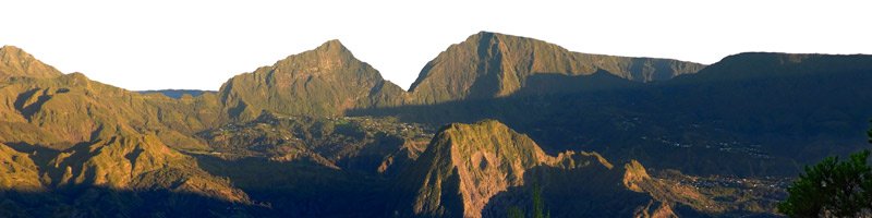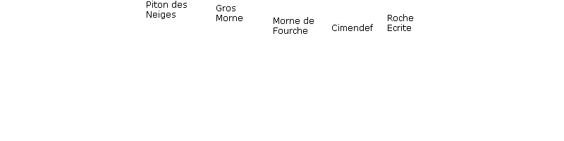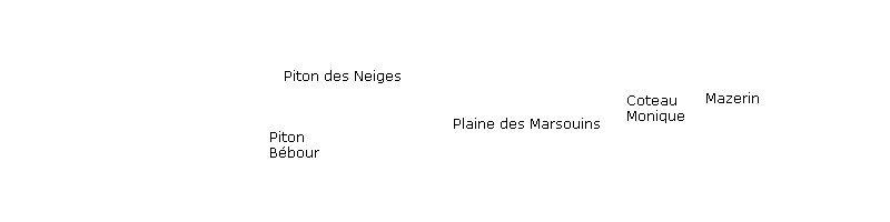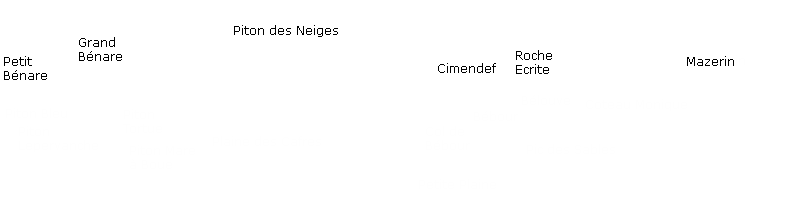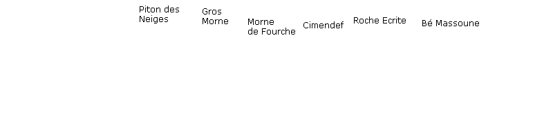 A gauche : Le Cap Anglais, le Gros Morne et le Piton des NeigesAu centre : Grand Ilet, le Morne de Fourche et le Cimendef - Devant : le Trou de Fer.
