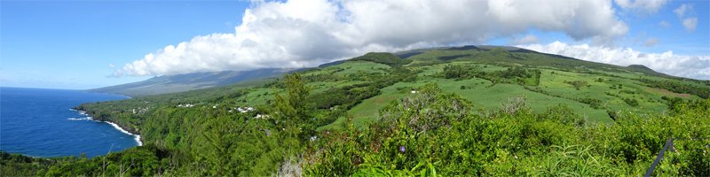 A gauche : L'océan vers Saint-BenoîtAu centre : Les anciennes plantations de thé recouvertes de fougères et les flancs de la Fournaise