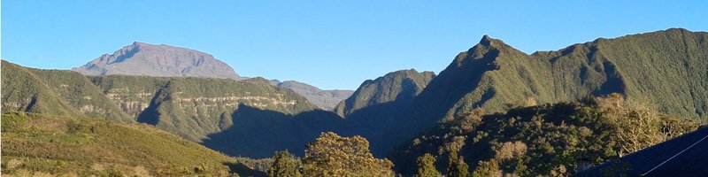 A gauche : Le Piton des NeigesAu centre : Le Gîte de la Caverne Dufour