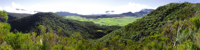 A gauche : La Plaine des Cafres et le Piton RougeAu centre : Les prairies
