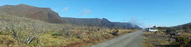 A gauche : Vers le Col de Bébour, le Pic des SablesAu centre : la RN3, le Gros Piton Rond