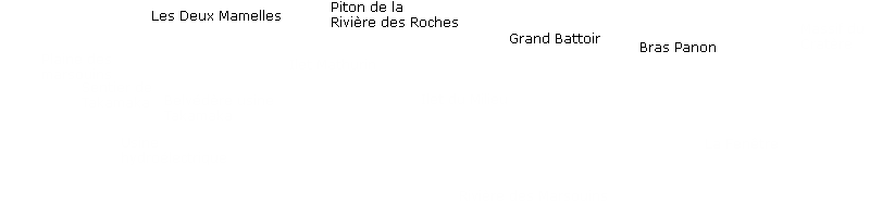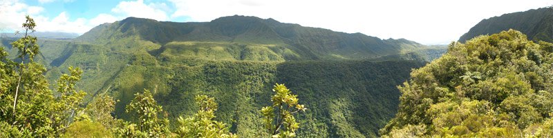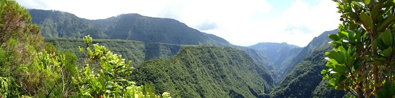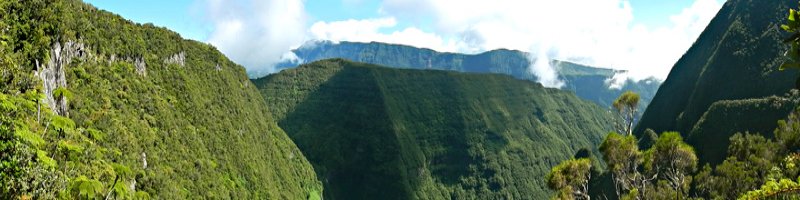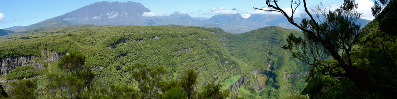 A gauche : Le Petit Bras Magasin et la Cascade du Bras MagasinAu centre : Le Piton Dorseuil, la Vallée de la Rivière des Marsouins et celle du Bras Cabot.