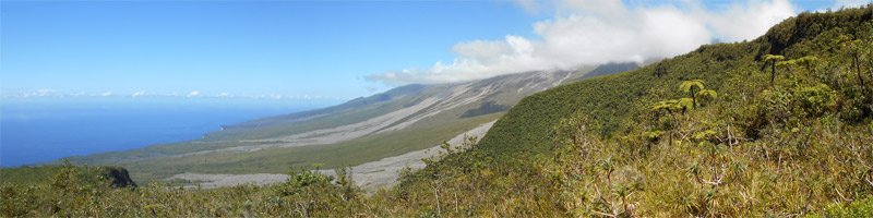 Au centre : Les anciennes plantations de thé recouvertes de fougères et les flancs de la Fournaise