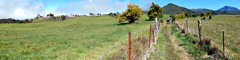 A gauche : Les prairies vers le Piton DoretAu centre : Le sentier bordé de clôtures