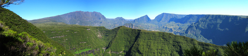 Au centre : Le Piton Dorseuil, la Vallée de la Rivière des Marsouins et celle du Bras Cabot.