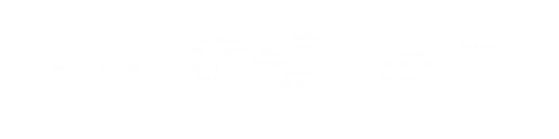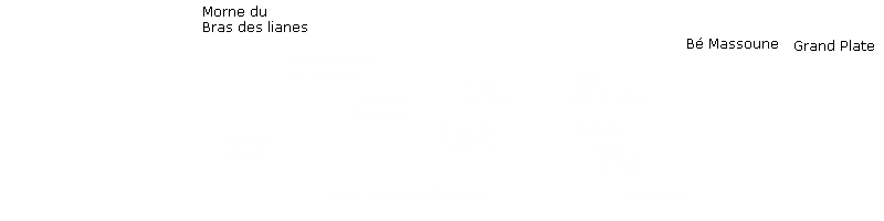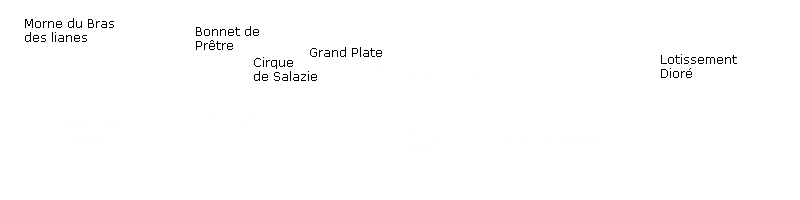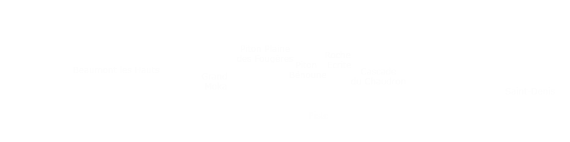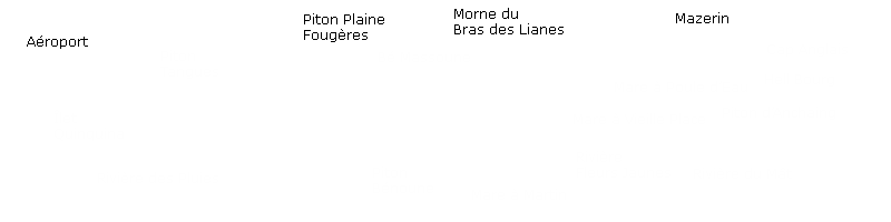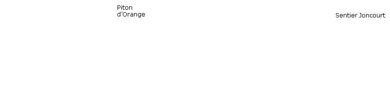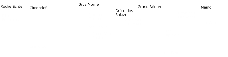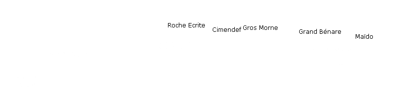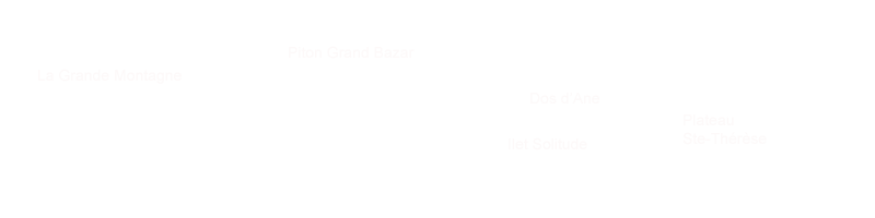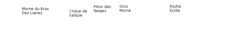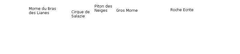 A gauche : La montée vers le Piton Fougères, la Roche Ecrite et le CimendefAu centre : Le Gros Morne, le Piton Cabris et la Roche Verre Bouteille