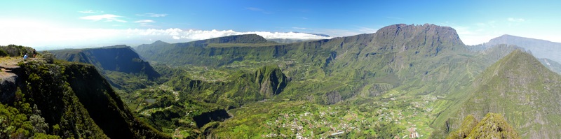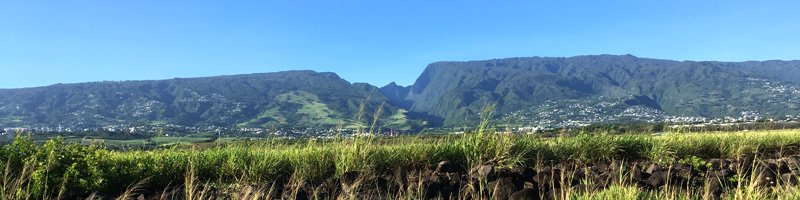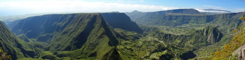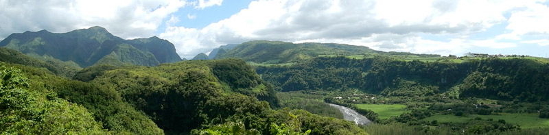 A gauche : Le Mazerin et le Trou de ferAu centre : Le Cap Argile, la Rivière du Mât et au loin le Cirque de Salazie