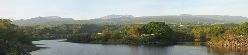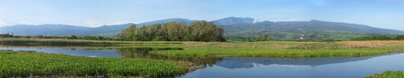A gauche : Le Massif de la FournaiseAu centre : L'étang et le Gros Morne à l'horizon