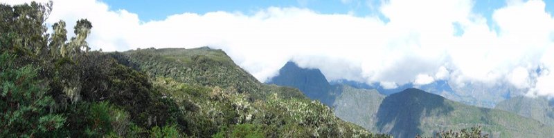A gauche : Dessus de Dos d'Ane - la montée à la Roche EcriteAu centre : La Crête de la Marianne, le Gros Morne et la Roche Ecrite
