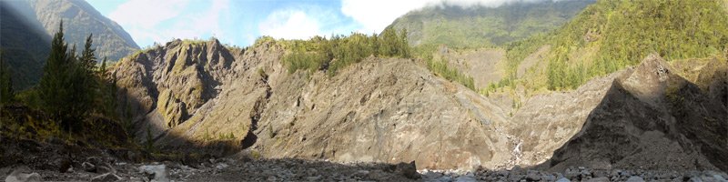 A gauche : Les flancs du Piton FougèresAu centre : L'ensemble de l'éboulis