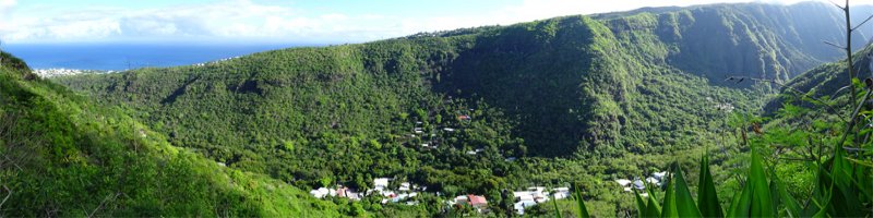 A gauche : La Forêt Domaniale de la Roche Ecrite et la vallée de la Rivière St-DenisAu centre : La descente vers l'Îlet à Guillaume