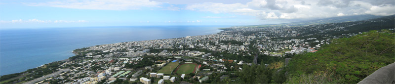A gauche : L'océan et le Quartier LambertAu centre : La ville de Saint-Denis, le Stade de la Redoute et le Pont Vinh San
