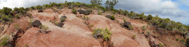 A gauche : Le flanc de la colline de terre rouge recouverte de roches sombresAccéder à la randonnée