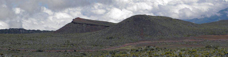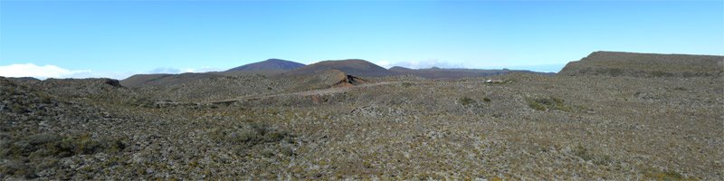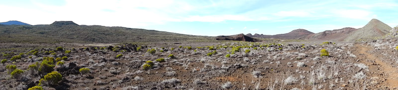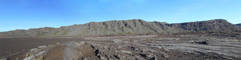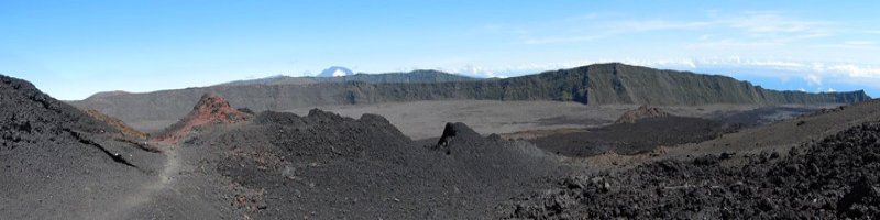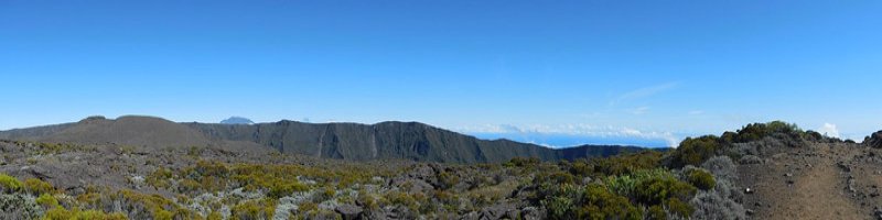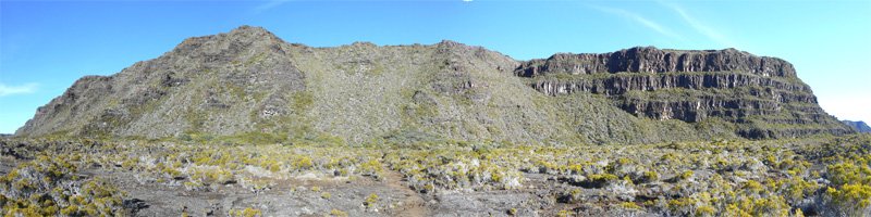 A gauche : Le sentier dans les scories et le Piton Chisny qui dépasseAu centre : Le Rempart de Bellecombe cachant un peu le Piton des Neiges