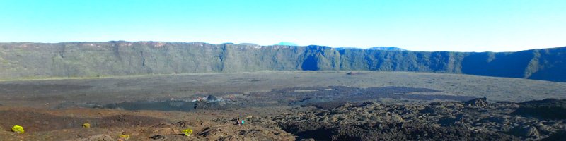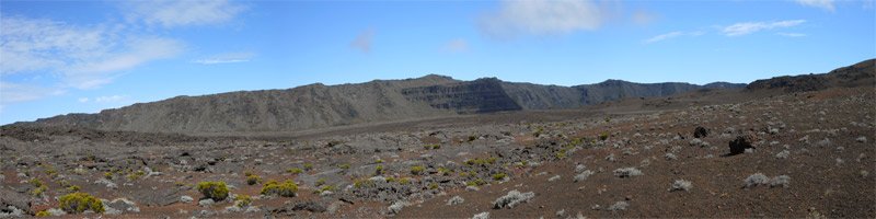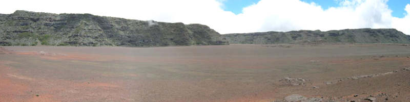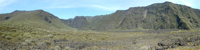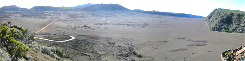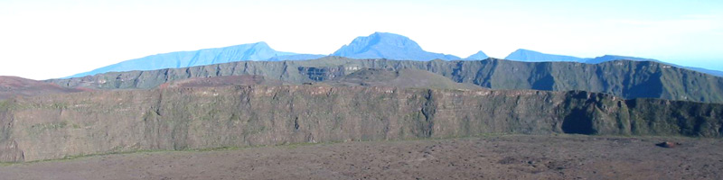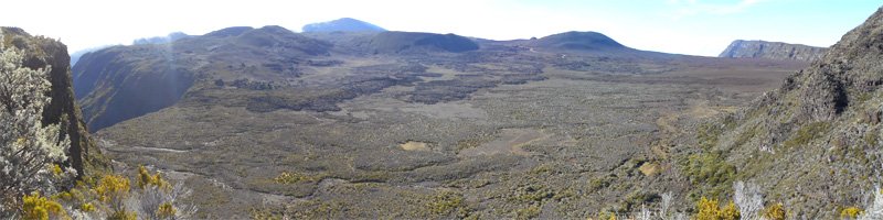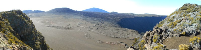 A gauche : Le Grand Bénare, le Pas des SablesAu centre : Au centre l'Enclos Fouqué (1er plan) , la Plaine des Sables (2ème plan), le Piton des Neiges (horizon).