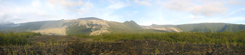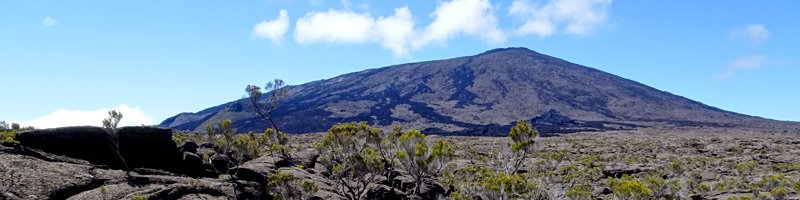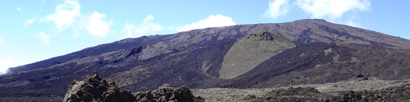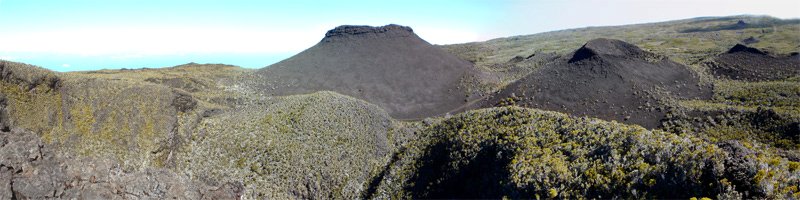 A gauche : La coulée de 2000 Au centre : le Piton de Crac et le sommet de la Fournaise