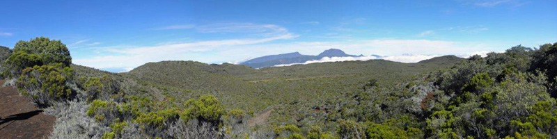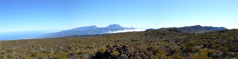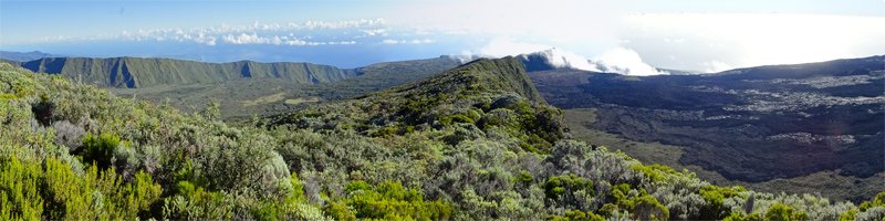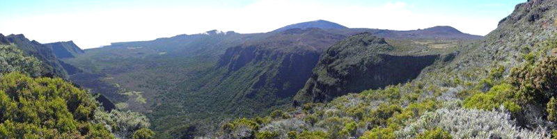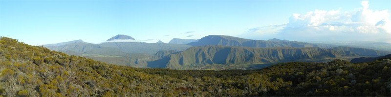 A gauche : Le Nez de Boeuf, les flancs du CommersonAu centre : La Plaine des Cafres et le Piton des Neiges