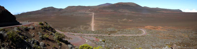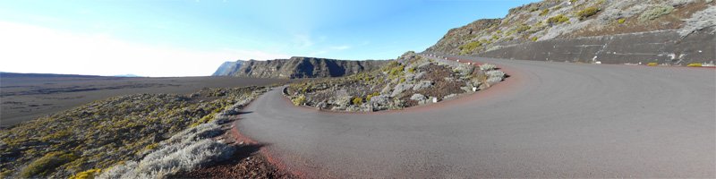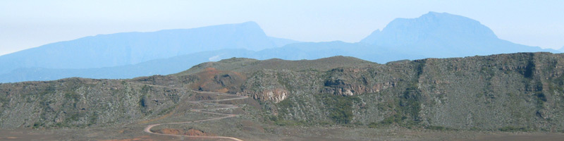 A gauche : La route, le Piton Haüy et le Demi-PitonAu centre : La route, le Piton Chisny et le Piton de la Fournaise