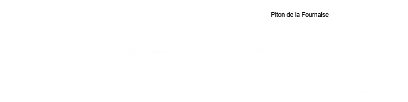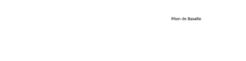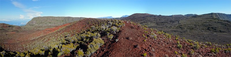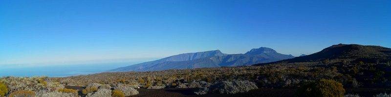 A gauche : Le Piton Haüy, le Demi-PitonAu centre : La Plaine des Sables, le Chisny et le Fournaise