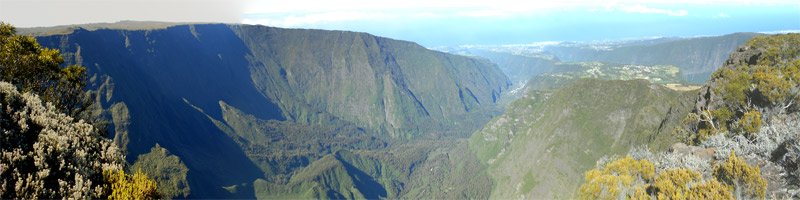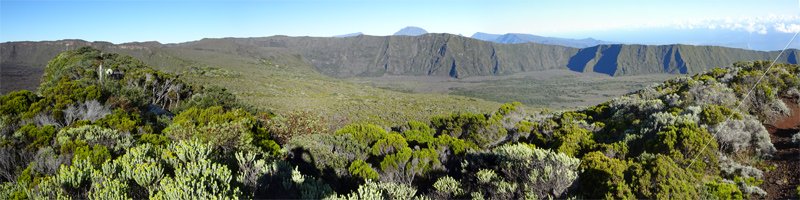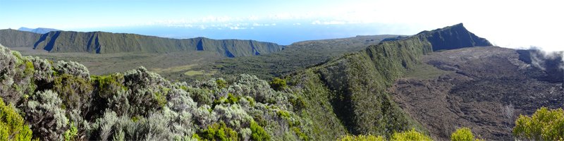 A gauche : Le Nez de Boeuf et les BénaresAu centre : Au centre la caldeira de la Rivière des Remparts, la Plaine des Cafres et le Piton des Neiges