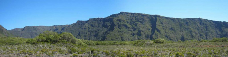 A gauche : le rempart du Morne LangevinAu centre : Au fond, le Piton des Neiges et le Grand Bénare.