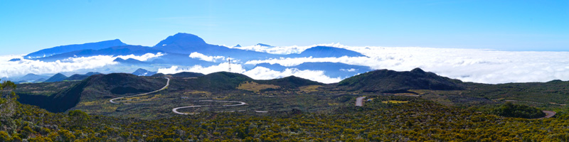 Au centre : La route, le Piton Chisny et le Piton de la Fournaise